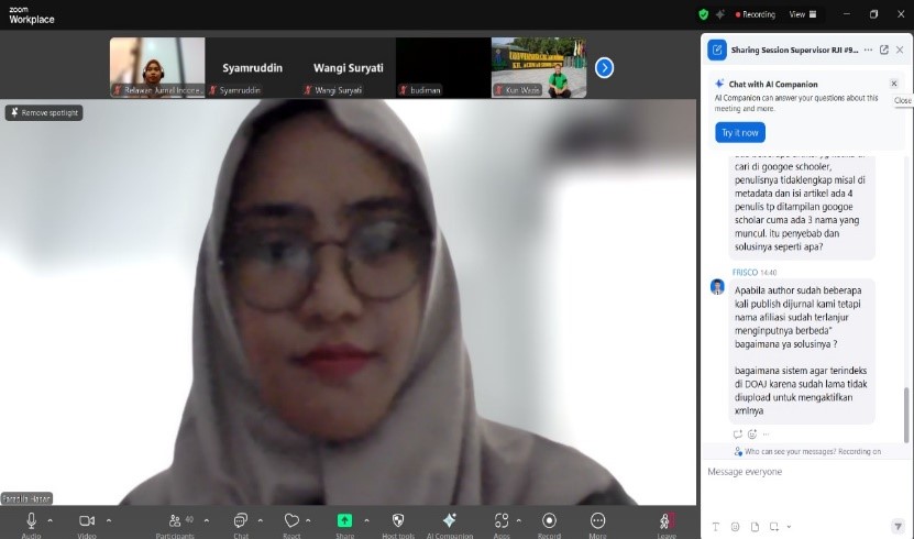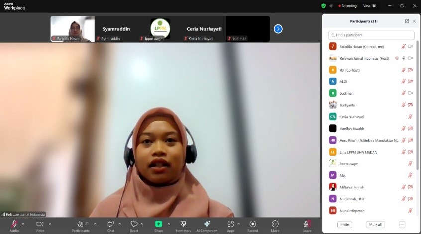 Dalam sesi inti, Faradila Hasan memaparkan materi komprehensif mengenai pentingnya metadata dalam artikel ilmiah. Beliau menjelaskan bahwa metadata bukan sekadar data teknis, melainkan elemen strategis yang krusial untuk meningkatkan visibilitas dan keterindeksan artikel dalam berbagai basis data ilmiah, baik di tingkat nasional maupun internasional. Materi yang disampaikan mencakup definisi metadata, elemen-elemen pentingnya, serta praktik terbaik dalam penyusunannya sesuai dengan standar pengelolaan jurnal modern. Sesi pemaparan dilanjutkan dengan sesi tanya jawab dan diskusi interaktif yang disambut antusias oleh peserta. Para peserta memanfaatkan kesempatan ini untuk menyampaikan pertanyaan, berbagi pengalaman, dan mendiskusikan kendala teknis yang mereka hadapi dalam pengelolaan metadata artikel di jurnal masing-masing. Sesi ini menjadi momen yang sangat bermanfaat karena memfasilitasi pertukaran pengetahuan dan solusi langsung dari narasumber maupun sesama pengelola jurnal.
