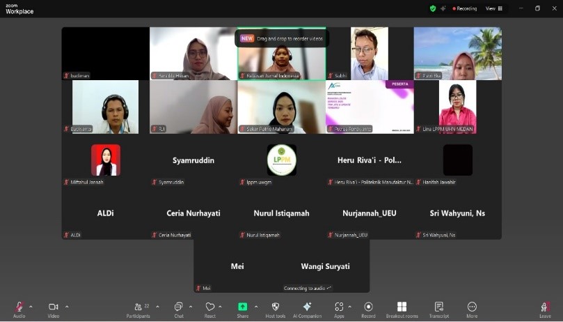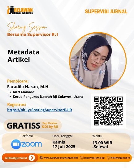 Manado, 17 Juli 2025 – Supervisi Relawan Jurnal Indonesia (RJI) sukses menyelenggarakan kegiatan Sharing Session Supervisor RJI ke-9 dengan mengangkat tema “Metadata Artikel” pada Kamis, 17 Juli 2025. Acara daring yang berlangsung mulai pukul 13.00 WIB ini menghadirkan narasumber utama, Faradila Hasan, M.H., yang merupakan Ketua Rumah Jurnal LP2M IAIN Manado sekaligus Ketua Pengurus Daerah RJI Sulawesi Utara. Kegiatan yang dilaksanakan secara daring melalui Zoom Meeting ini diikuti oleh para pengelola jurnal dari berbagai institusi di seluruh Indonesia, menunjukkan tingginya antusiasme terhadap isu metadata. Acara diawali dengan sambutan dan pembukaan oleh moderator yang memandu jalannya kegiatan secara interaktif dan tertib.